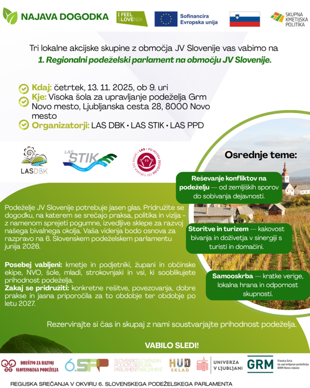 Podeželje JV Slovenije potrebuje jasen glas. Pridružite se dogodku, na katerem se srečajo praksa, politika in vizija — z namenom sprejeti pogumne, izvedljive sklepe za razvoj našega bivalnega okolja. Vaša videnja bodo osnova za razpravo na 6. Slovenskem podeželskem parlamentu junija 2026.